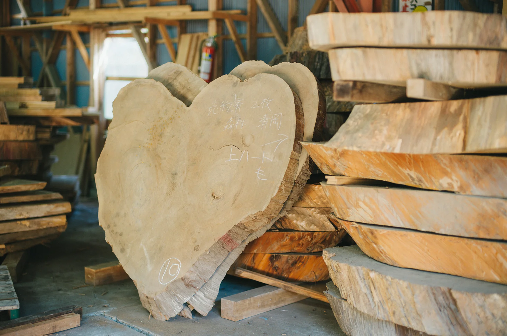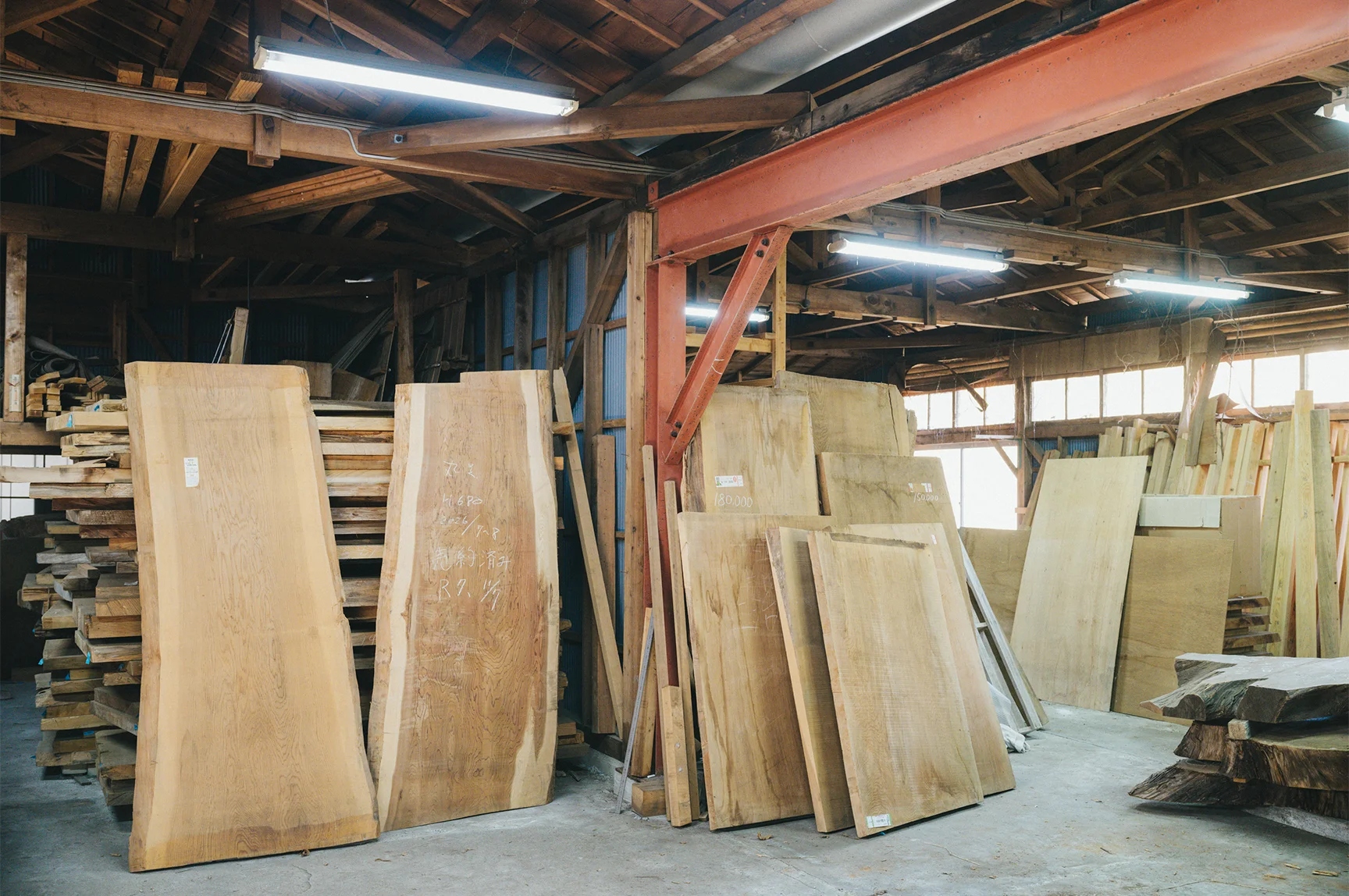 工芸部門では、長年倉庫で乾燥・保管してきた天然魚梁瀬杉を中心とした材木を販売しています。建材用丸太の根元部分を板材や輪切り材として保管してきたもので、いずれも大きなサイズと、天然材ならではの風合いが特徴です。